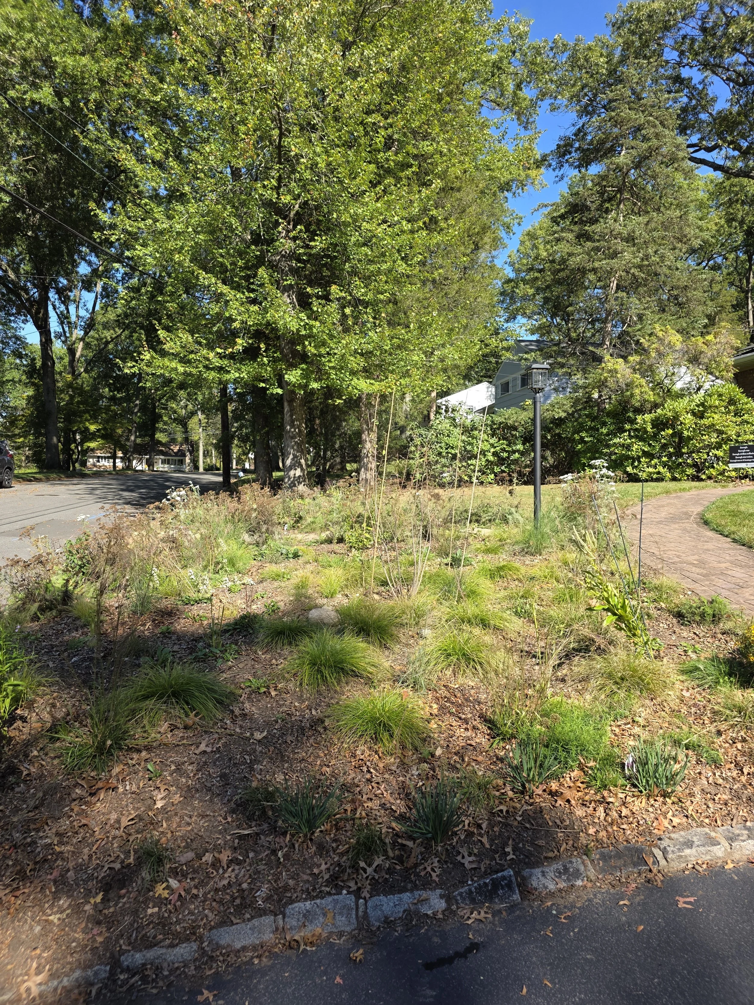 after: one year after planting, native grasses are filling out nicely, and the flowering plants are filling in slowly despite heavy deer pressure